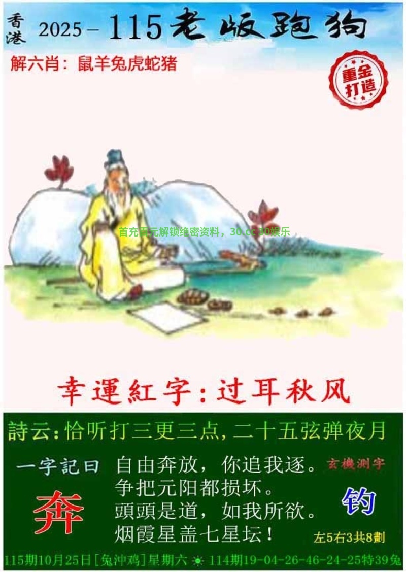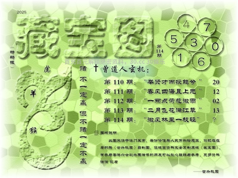 111期藏宝图:【春风四海且上元】 浅解:春风四海且上元,解春肖虎兔龙 综合生肖:牛猪猴马蛇虎鼠龙鸡 |