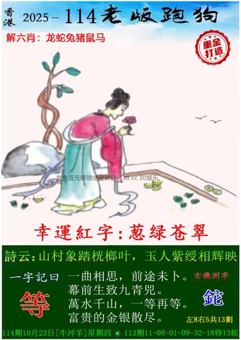 113期藏宝图:【二月飞花满江草】 浅解:二月飞花满江草,解二月解春天的生肖解兔虎龙 综合生肖:猴龙马猪虎鼠鸡蛇牛 |